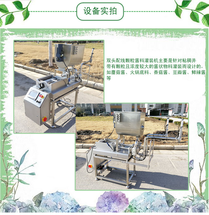 雙頭配線醬料灌裝機-臥式攪拌香菇醬灌裝機針對粘稠并帶有顆粒且濃度較大的醬狀物料灌裝而設計的,如蘑菇醬、火鍋底料、香菇醬、豆瓣醬、鮮辣醬等灌裝的臥式攪拌醬料灌裝機,臥式攪拌,確保醬和油的充分混合,灌裝物料更均勻,結構簡單、精確度高、操作簡便
